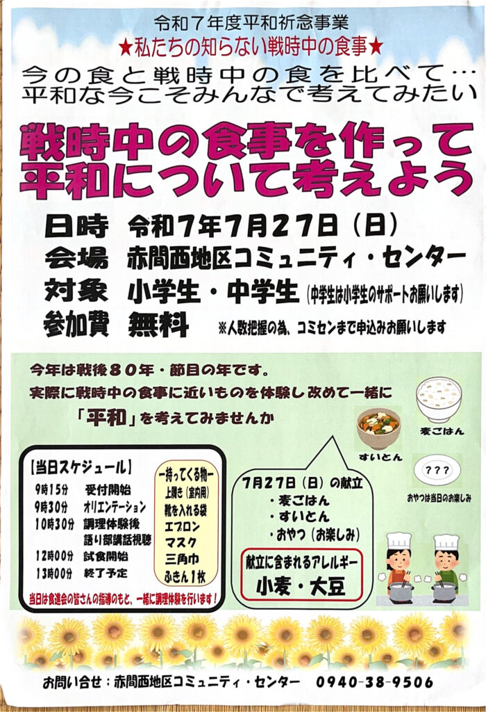 今年度はパネル展示と語り部講話に加えて、平和祈念事業として戦時中の食事体験があります。