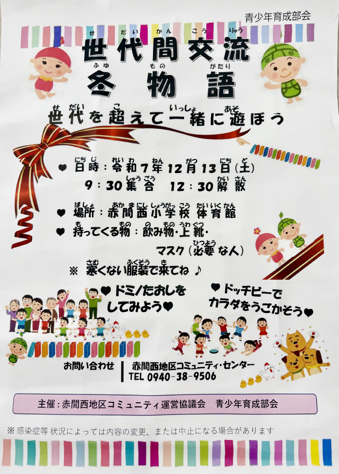 今週の土曜日、小学校の体育館を会場に、コミセンイベント「世代間交流冬物語」が開催されます♫